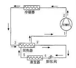 同時(shí)也加熱了回氣管的溫度,避免壓縮機(jī)吸入過(guò)潮蒸汽而可能產(chǎn)生液擊。毛細(xì)管節(jié)流的系統(tǒng),毛細(xì)管與回氣管(吸氣管)合并在一起走,有合焊在一起的(大金VRV就是采用的此種方法),有用熱膠套套在一起的,有從回氣管中穿過(guò)的,還有纏繞在回氣管上的,也有的將毛細(xì)管或供液管直接在箱體內(nèi)通過(guò)。毛細(xì)管與回氣管進(jìn)行熱交換,使節(jié)流前的液態(tài)制冷劑與回氣管道中的低溫制冷劑蒸汽進(jìn)行熱交換冷卻而得到過(guò)冷,這樣既可減少回氣管路中可能夾帶的液體液擊壓縮機(jī),同時(shí)又能達(dá)到節(jié)流前液體制冷劑過(guò)冷的目的。當(dāng)然還有采用回?zé)崞鞯?,原理也是一樣,?qǐng)參見(jiàn)下圖:
