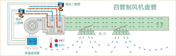 兩管制的空調(diào)箱中只是一組盤管,一進(jìn)一回,夏天通冷水,冬天通熱水。這樣的系統(tǒng)使得整個區(qū)域在同一時刻只能供冷或供熱。與四管制相比,它省下了一套水系統(tǒng),所以它的標(biāo)準(zhǔn)相對較低,成本也低。兩管制系統(tǒng)簡單,但施工方便,不過不能用于同時需要供冷和供熱的場所。