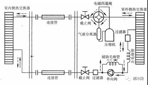 3、熱泵系統(tǒng) 。與單冷系統(tǒng)情況相同,熱泵運行是否正常,主要檢查四通換向閥的工作情況。換向閥換向時,可聽到有比較響的氣體流動聲以及電磁閥頂針的撞擊聲(電磁場吸動閥心),當電磁閥在換向過程中聽不到上述兩種聲音,那電磁閥可能出故障。