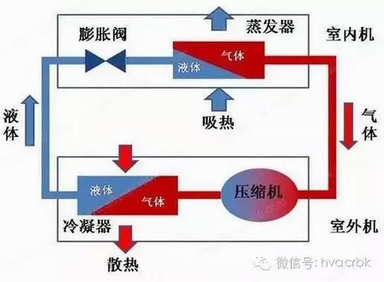 壓縮機(jī)將氣態(tài)的冷媒壓縮為高溫高壓的氣態(tài)冷媒,然后送到冷凝器(室外機(jī))散熱后成為常溫高壓的液態(tài)冷媒,所以室外機(jī)吹出來的是熱風(fēng)。然后到節(jié)裝裝置,進(jìn)入蒸發(fā)器(室內(nèi)機(jī)),由于冷媒從節(jié)流裝置到達(dá)蒸發(fā)器后空間突然增大,壓力減小,液態(tài)的冷媒就會(huì)汽化,變成氣態(tài)低溫的冷媒,從而吸收大量的熱量,蒸發(fā)器就會(huì)變冷,室內(nèi)機(jī)的風(fēng)扇將室內(nèi)的空氣從蒸發(fā)器中吹過,所以室內(nèi)機(jī)吹出來的就是冷風(fēng);空氣中的水蒸汽遇到冷的蒸發(fā)器后就會(huì)凝結(jié)成水滴,順著水管流出去,這就是空調(diào)會(huì)出水的原因。氣態(tài)的冷媒回到壓縮機(jī)繼續(xù)壓縮,繼續(xù)循環(huán)。