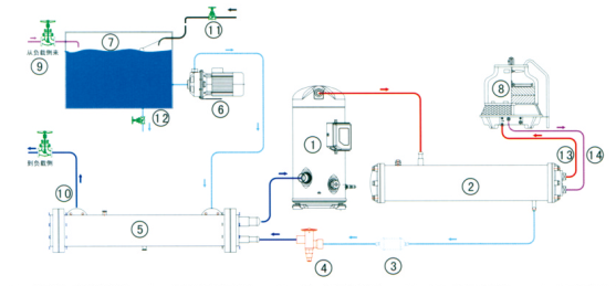 1、壓縮機 2、殼管式冷凝器 3、干燥過濾器 4、熱力膨脹閥 5、干式蒸發(fā)器 6、不銹鋼水泵 7、水箱