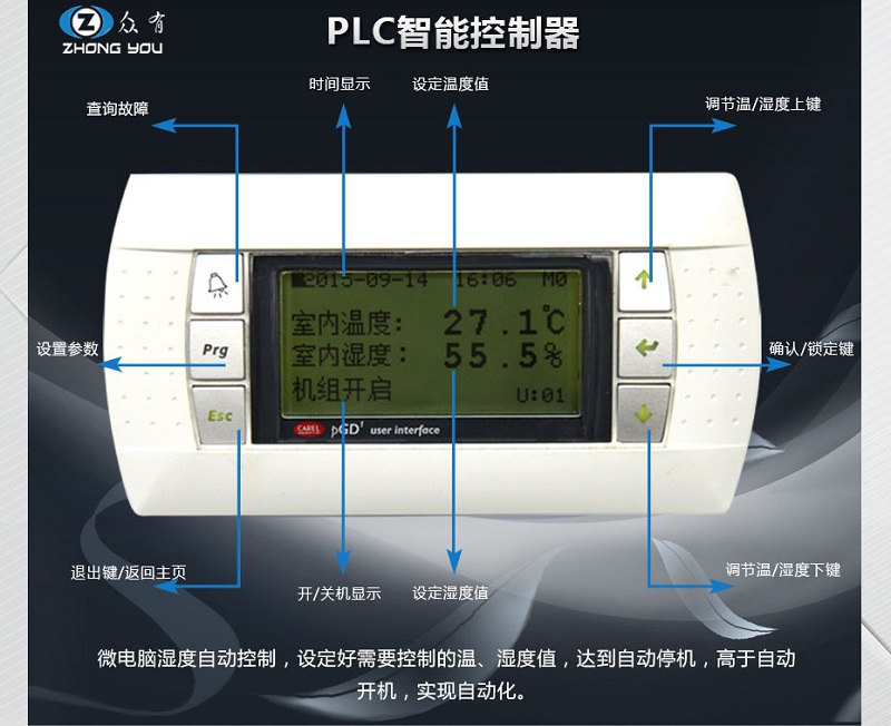 1. 采用國際品牌可編程PLC控制器,獨(dú)有的微電腦智能全自動(dòng)控制系統(tǒng),用戶只要設(shè)定好所需的溫濕度控制范圍,機(jī)組即自動(dòng)判斷運(yùn)行負(fù)荷進(jìn)行能量調(diào)節(jié),按最經(jīng)濟(jì)的運(yùn)行模式自動(dòng)運(yùn)行,節(jié)約了運(yùn)行費(fèi)用;控制器預(yù)留遠(yuǎn)程控制接口,可方便用戶遠(yuǎn)程集中控制,節(jié)省管理。