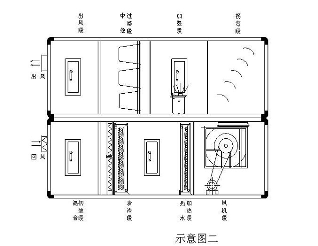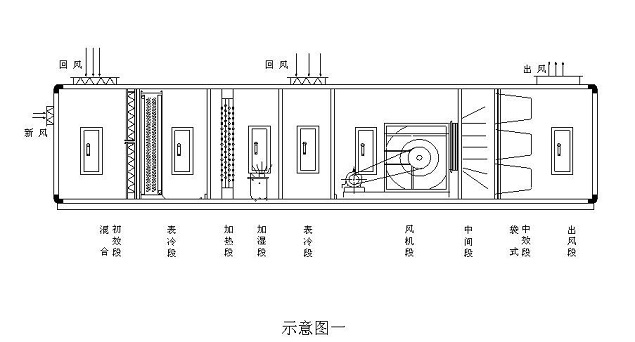 本段起過渡段的連接和機組內(nèi)部檢修照明用。在過濾段前,表冷段、加熱段、消聲段前后均須設(shè)中間段.